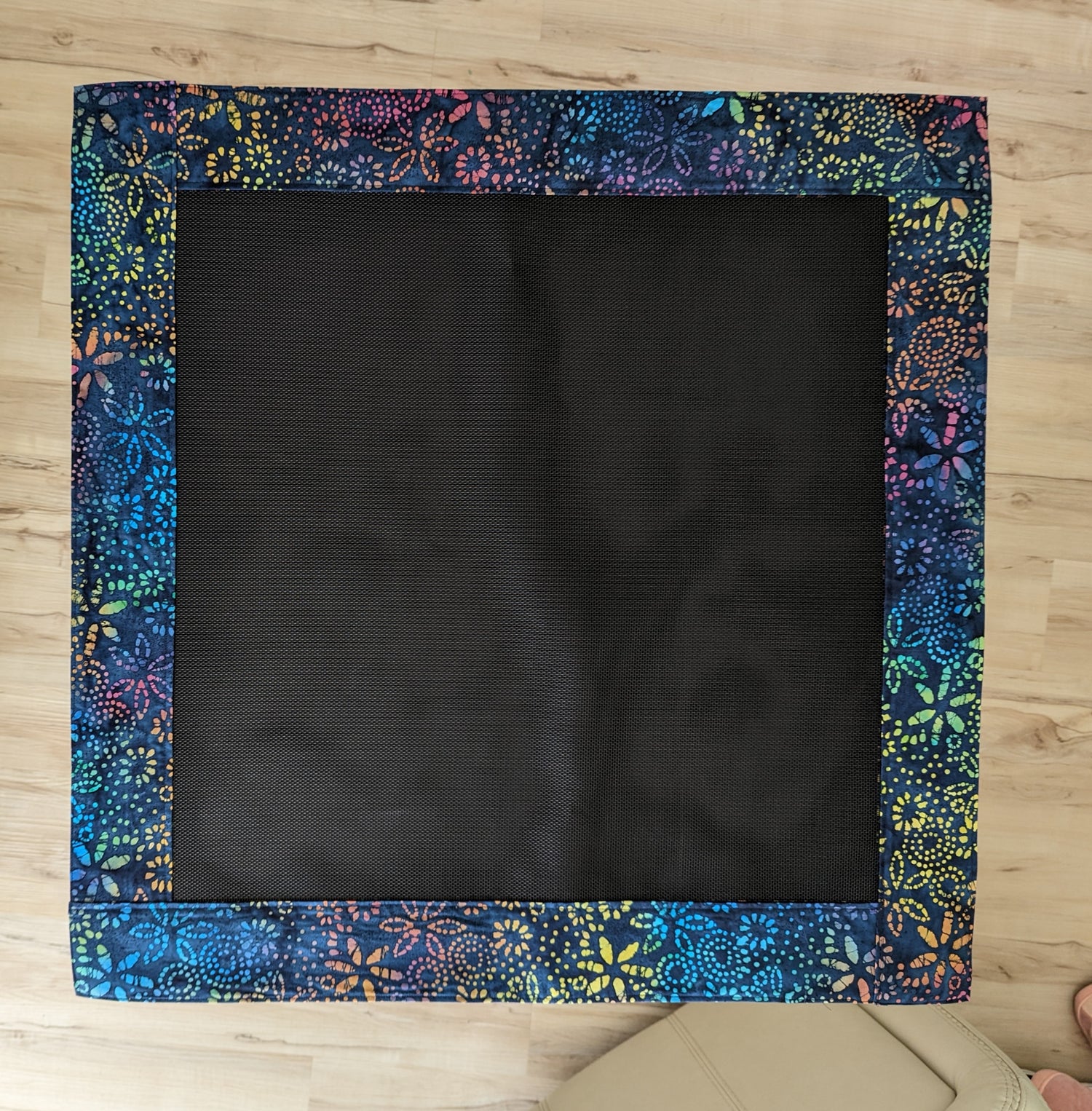 These table toppers can be custom ordered with your choice of fabric color & design or you can purchase what is in stock. 100% Cotton Fabric. The middle is a heavy duty pet screen. Tiles slide easily on the topper and absorb noise. Colors may vary when seen in person.
